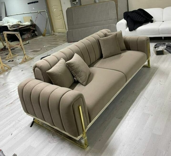 Découvrez ce canapé design en velours beige avec son cadre doré élégant. Parfait pour les salons modernes, il offre un confort exceptionnel et un style raffiné. Disponible en différentes configurations pour s'adapter à vos besoins.