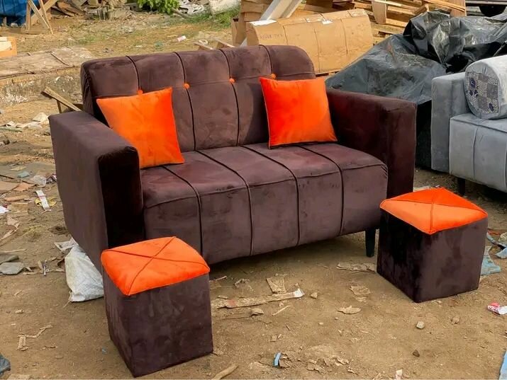 Ensemble de salon comprenant un canapé marron et deux ottomans assortis. Conçu pour le confort, cet ensemble est idéal pour les salons modernes. Tissu en velours marron et coussins orange pour une touche de couleur.
