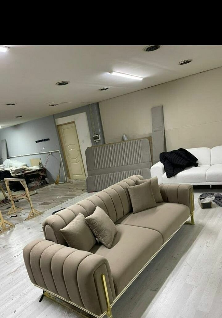 Canapé moderne en tissu marron avec pieds dorés. Parfait pour salon élégant. Confortable et design.