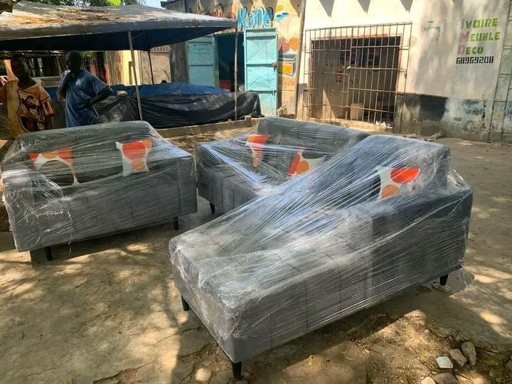 Canapé gris moderne pour salon, emballé sous film plastique. Idéal pour les intérieurs contemporains.