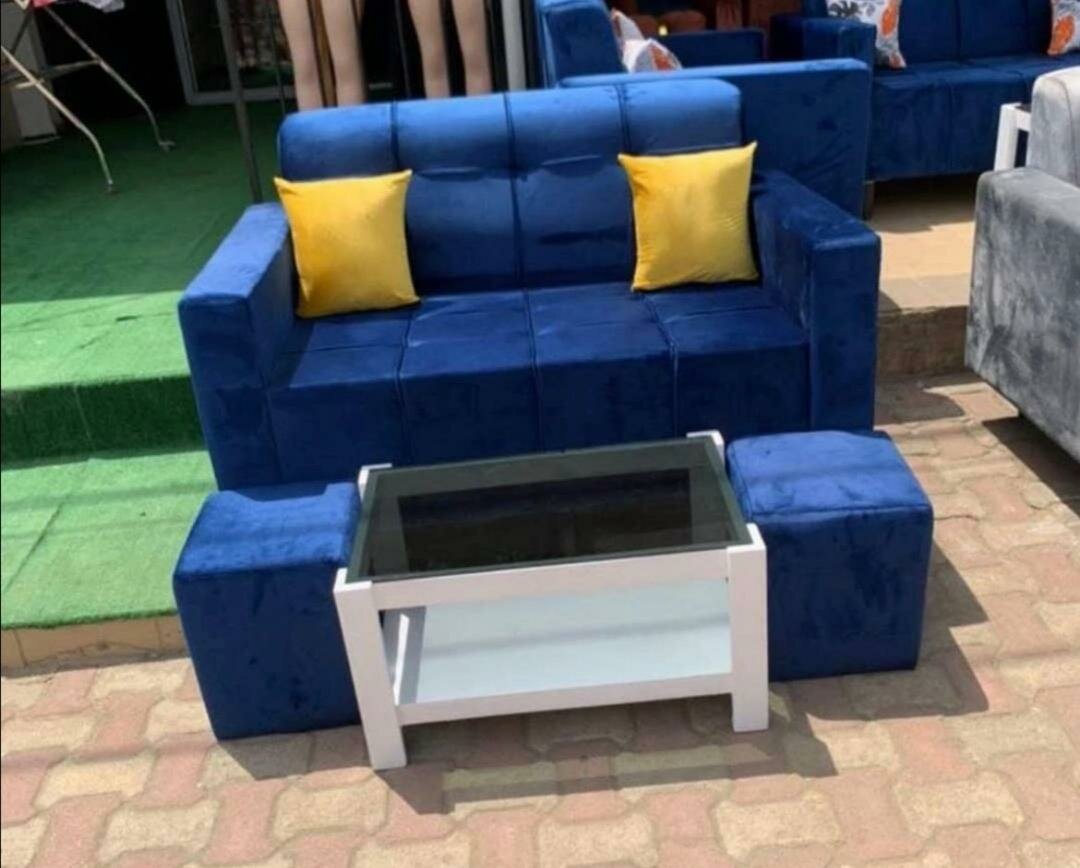 Canapé 3 places en velours bleu avec 2 coussins jaunes. Idéal pour le salon ou la salle de séjour. Confortable et élégant, il est parfait pour se détendre chez soi.