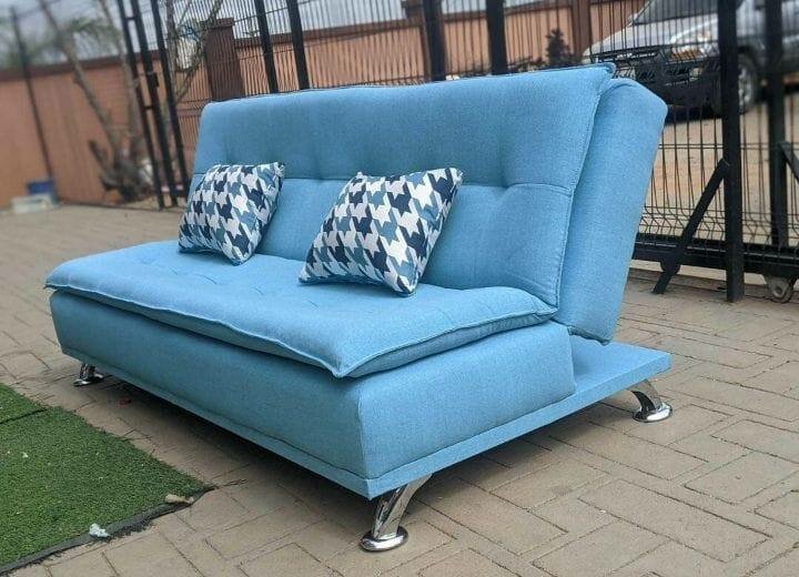 Canapé-lit bleu moderne avec deux oreillers à motifs. Design élégant et confortable, idéal pour le salon ou la chambre. Facile à utiliser et à entretenir.
