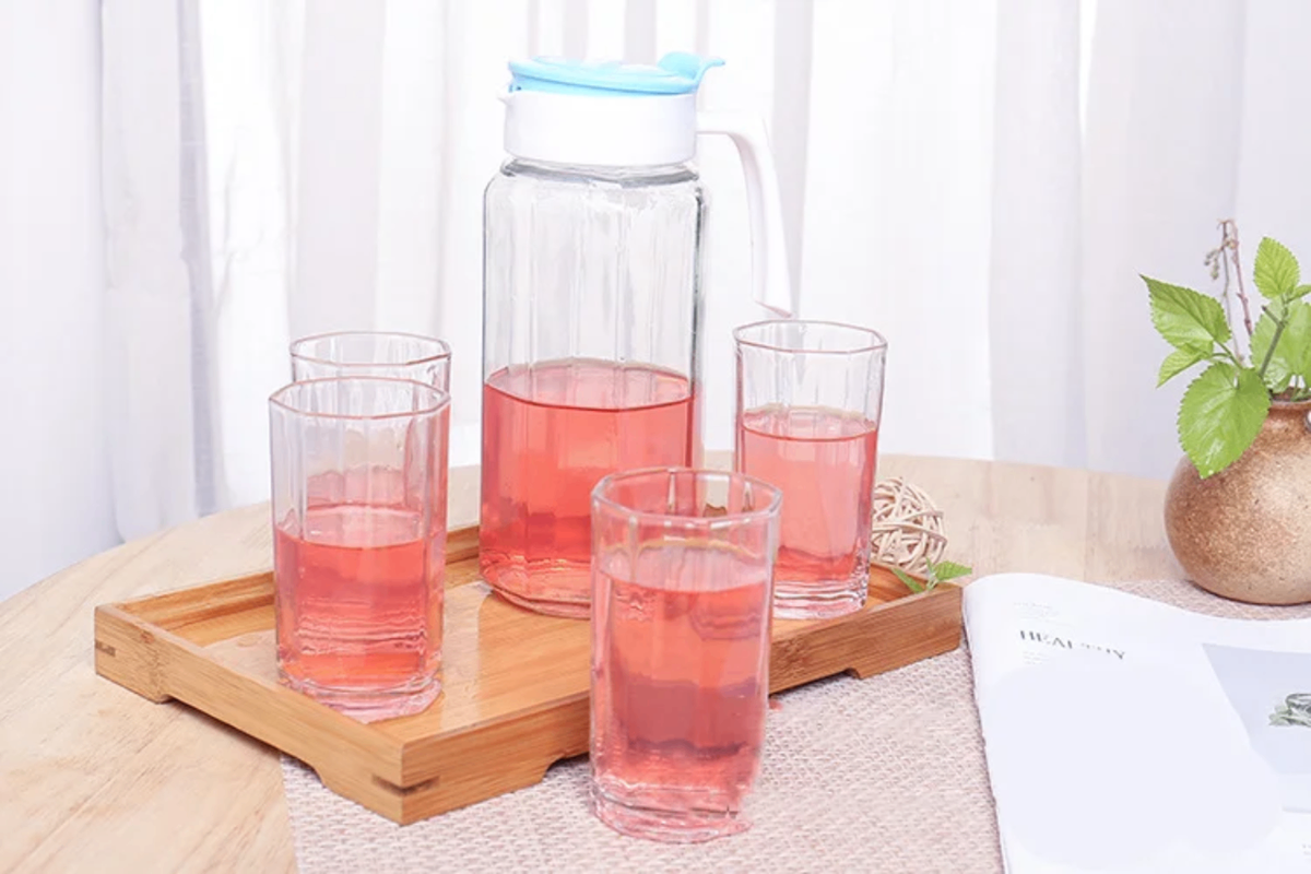 Carafe en verre élégante avec 5 verres inclus. Parfaite pour servir de l'eau, du jus ou des boissons rafraîchissantes durant vos repas. Design moderne et fonctionnel, idéale pour la maison ou les réceptions. Résistante et facile à nettoyer, cette carafe est un choix pratique et esthétique pour votre cuisine ou salle à manger.