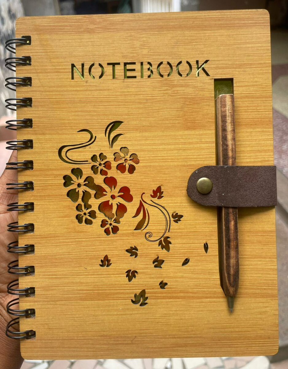 Carnet élégant avec couverture en bois gravée et stylo assorti. Idéal pour les notes créatives, les journaux ou les cadeaux uniques. Respectueux de l'environnement.