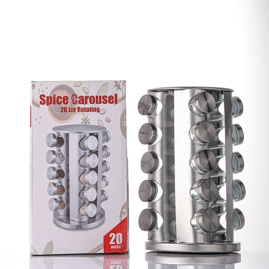 Organisez votre cuisine avec ce carousel à épices rotatif en acier inoxydable, comprenant 20 bocaux transparents pour un accès facile à vos épices préférées. Idéal pour les chefs amateurs et professionnels, ce support élégant économise de l'espace et ajoute une touche moderne à votre cuisine. Les bocaux hermétiques préservent la fraîcheur de vos épices. Parfait pour une utilisation quotidienne et des repas impressionnants.