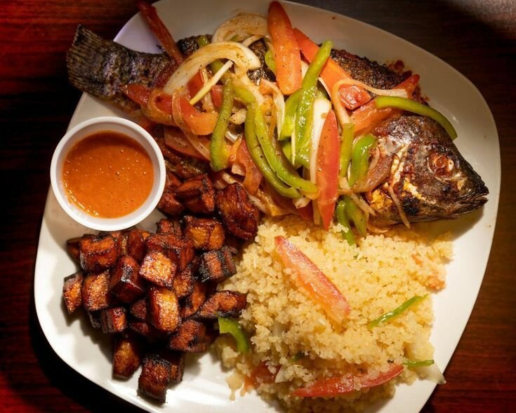 Poisson Carpe Braisé assaisonné Aux épices Du Cameroun + Attiéké & Alloco LES PLATS SONT DISPONIBLES À PARTIR DE 18HEURES JUSQU'À 20HEURES