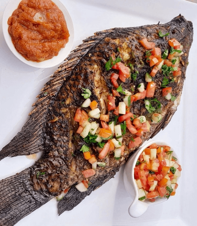 Poisson Carpe Braisée Assaisonnée Aux Épices Du Cameroun Accompagné D'Attiéké.