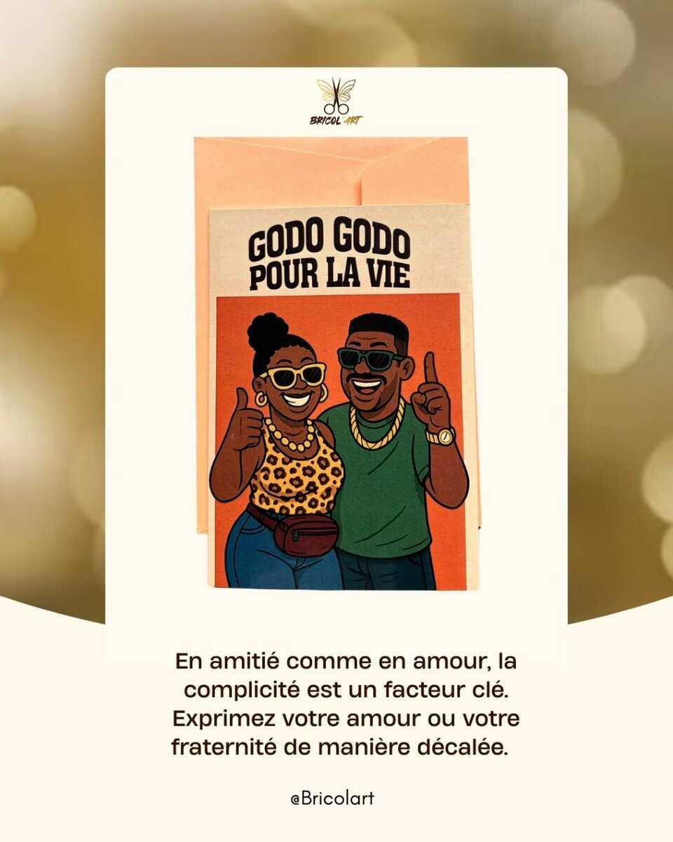 Exprimez votre amitié avec style grâce à cette carte humoristique "Godo Godo Pour La Vie", parfaite pour des rires et des sourires. Idéale pour célébrer les moments précieux avec vos proches.