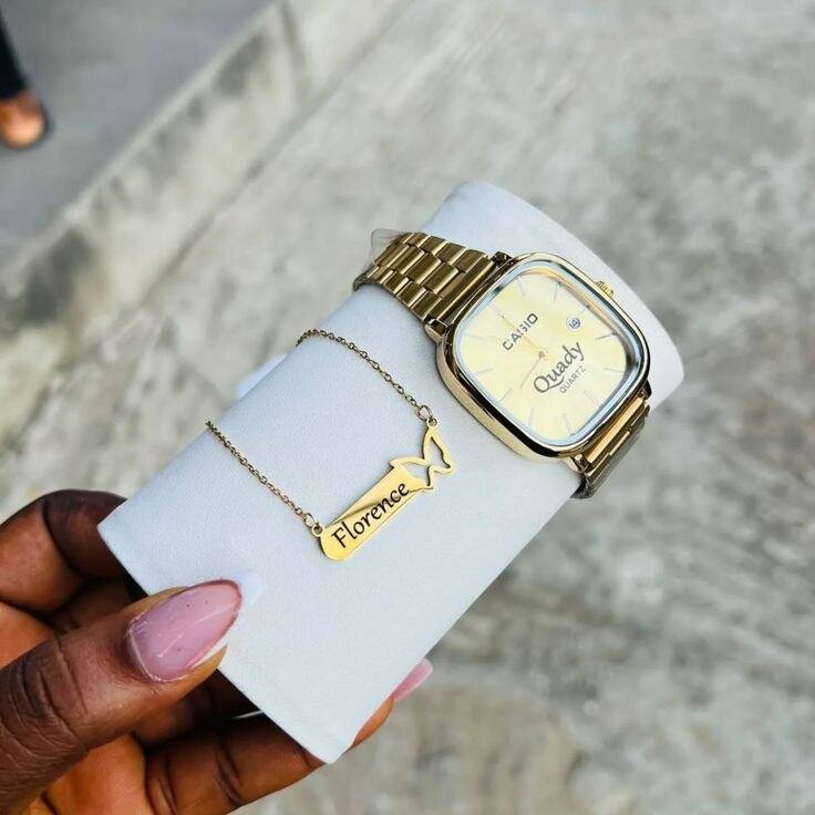 Découvrez le duo élégant : une montre Casio dorée au design rétro avec un bracelet en métal et un collier personnalisable. Idéal pour sublimer vos tenues.
