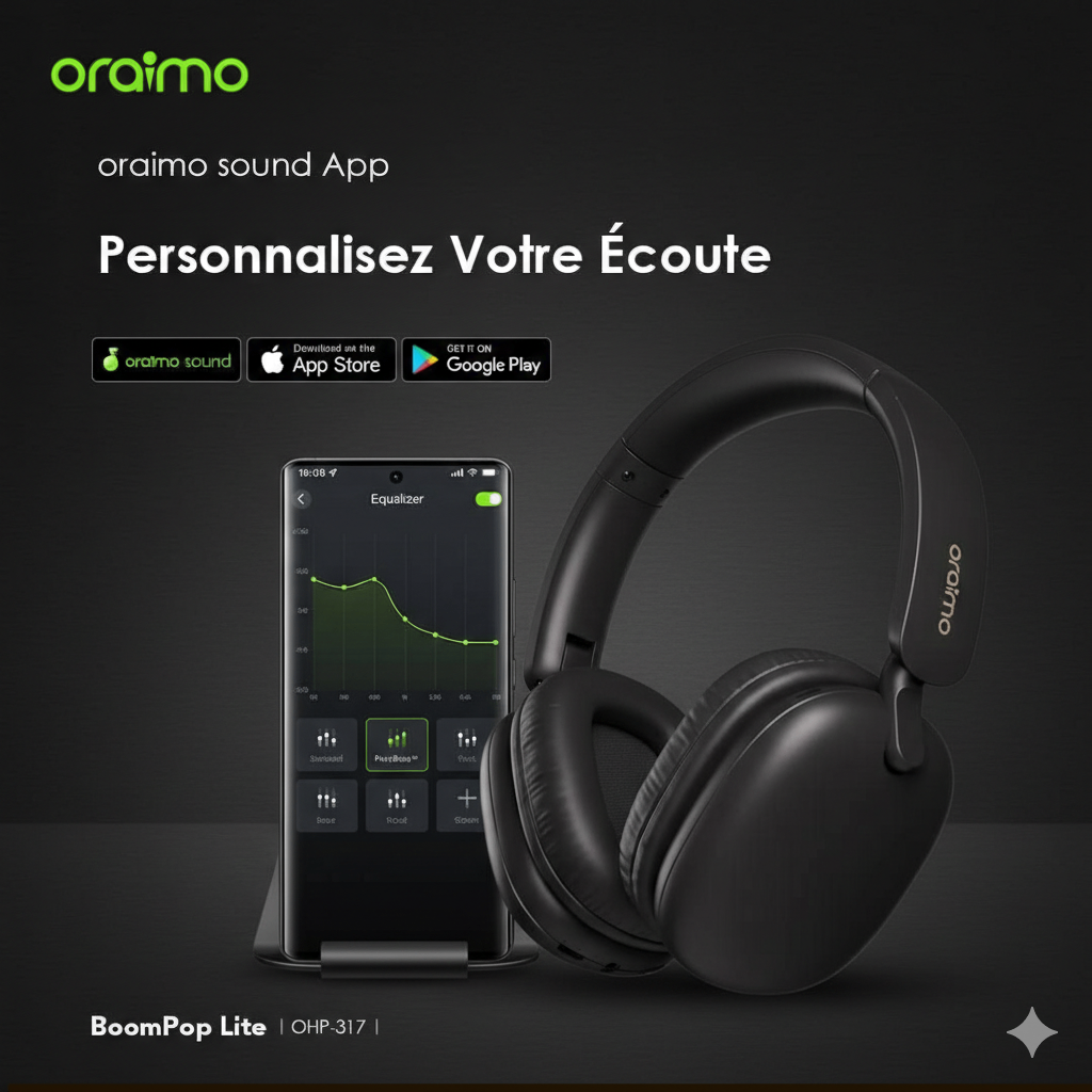 Découvrez le casque audio Bluetooth Oraimo BoomPop Lite pour une expérience sonore exceptionnelle. Personnalisez votre écoute avec l'application Oraimo Sound et profitez d'un son de qualité supérieure.