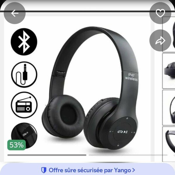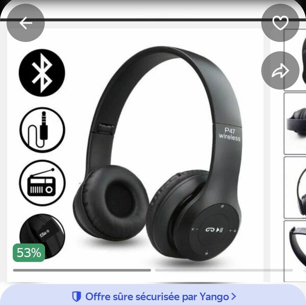 Découvrez le Casque Bluetooth P47 : un son impressionnant avec basses puissantes. Profitez de la liberté sans fil ou optez pour le mode filaire selon vos besoins. Insérez une carte pour écouter votre musique préférée partout. Conçu pour le confort avec des coussinets doux, c'est l'accessoire parfait pour les amateurs de musique en déplacement.