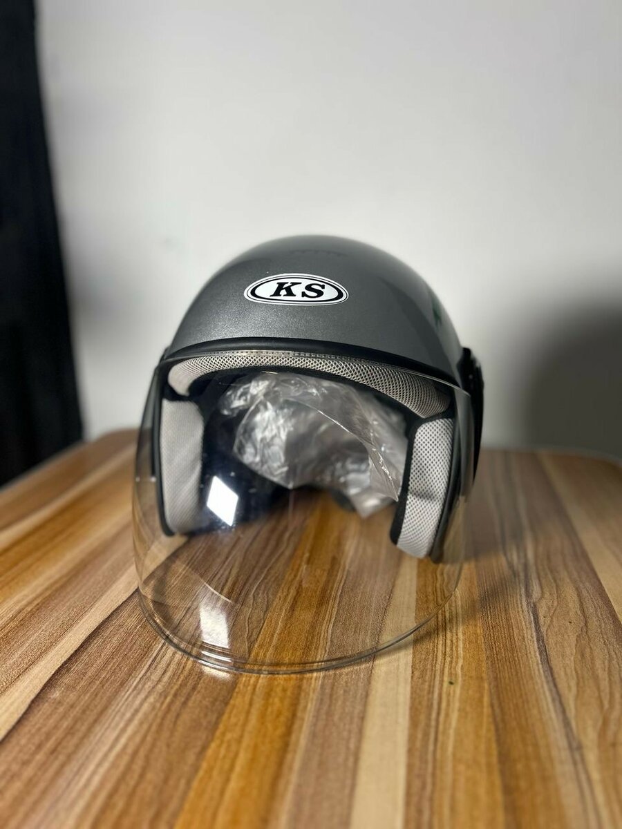 Casque de moto KS moderne, doté d'une visière transparente pour une protection optimale. Idéal pour les passionnés de deux-roues urbains et les motards. Confort et sécurité assurés grâce à son design ergonomique.