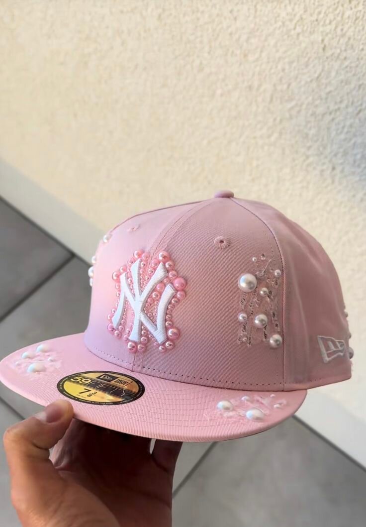 Casquette New Era rose embellie de strass et perles. Idéale pour les fans de baseball et de mode streetwear. Conçue pour un ajustement confortable et sécurisé.