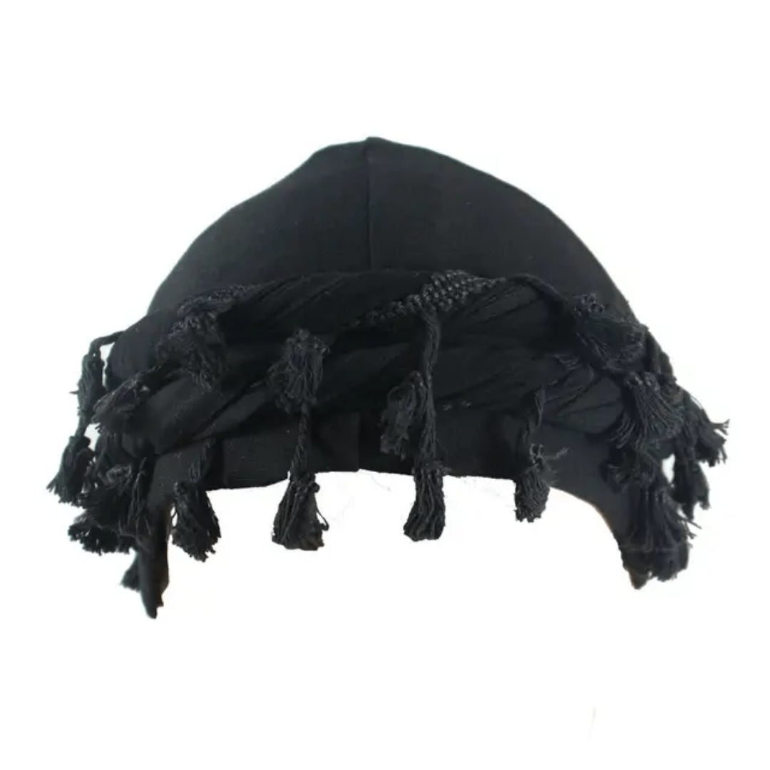 Casquette noire élégante et polyvalente avec franges décoratives. Convient pour divers styles et occasions.