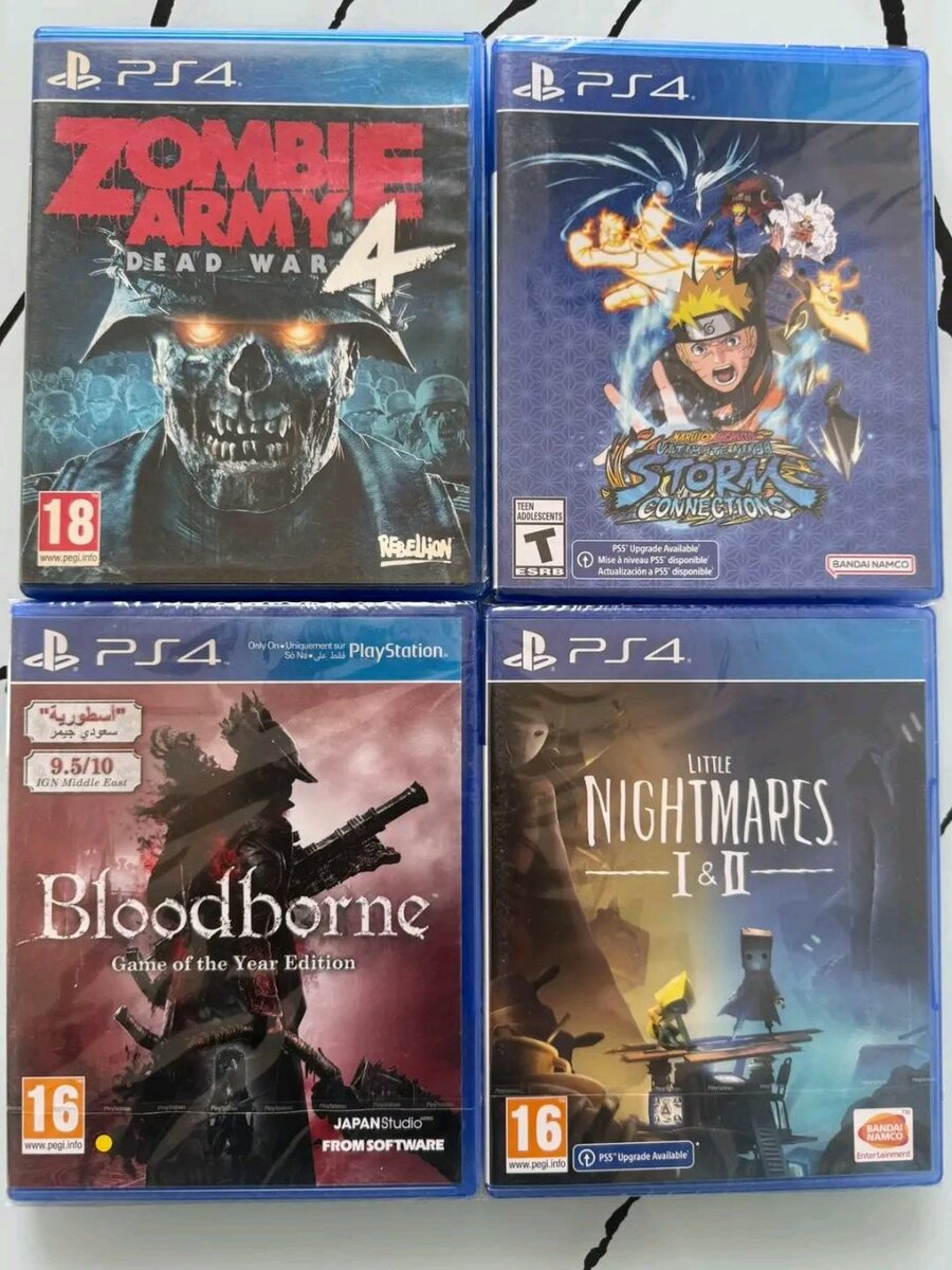 Lot de 4 jeux PS4 : Zombie Army 4, Naruto Storm, Bloodborne édition GOTY, Little Nightmares I & II. Plongez dans l'aventure avec ces titres captivants. Parfait pour les fans de divers genres!
