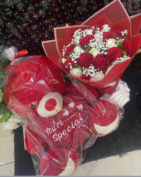 Bouquet de roses rouges et ours en peluche