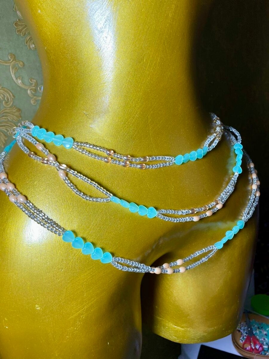 Sublimez votre style avec cette ceinture en perles aux teintes bleues et dorées. Parfaite pour ajouter une touche bohème chic à vos tenues, elle se porte idéalement sur une robe ou un pantalon taille haute. Un accessoire indispensable pour apporter une note d'originalité à votre look quotidien ou pour une occasion spéciale.