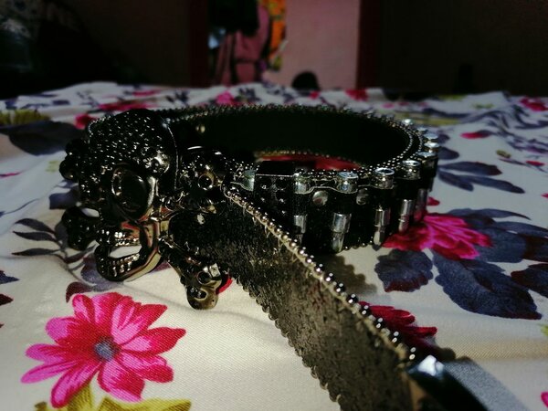 Exprimant un style audacieux, cette ceinture en cuir noir avec une tête de mort en métal argenté et des détails métalliques est l'accessoire idéal pour un look rock unique. Parfait pour les concerts, soirées ou ajouter une touche de rébellion à votre tenue quotidienne.