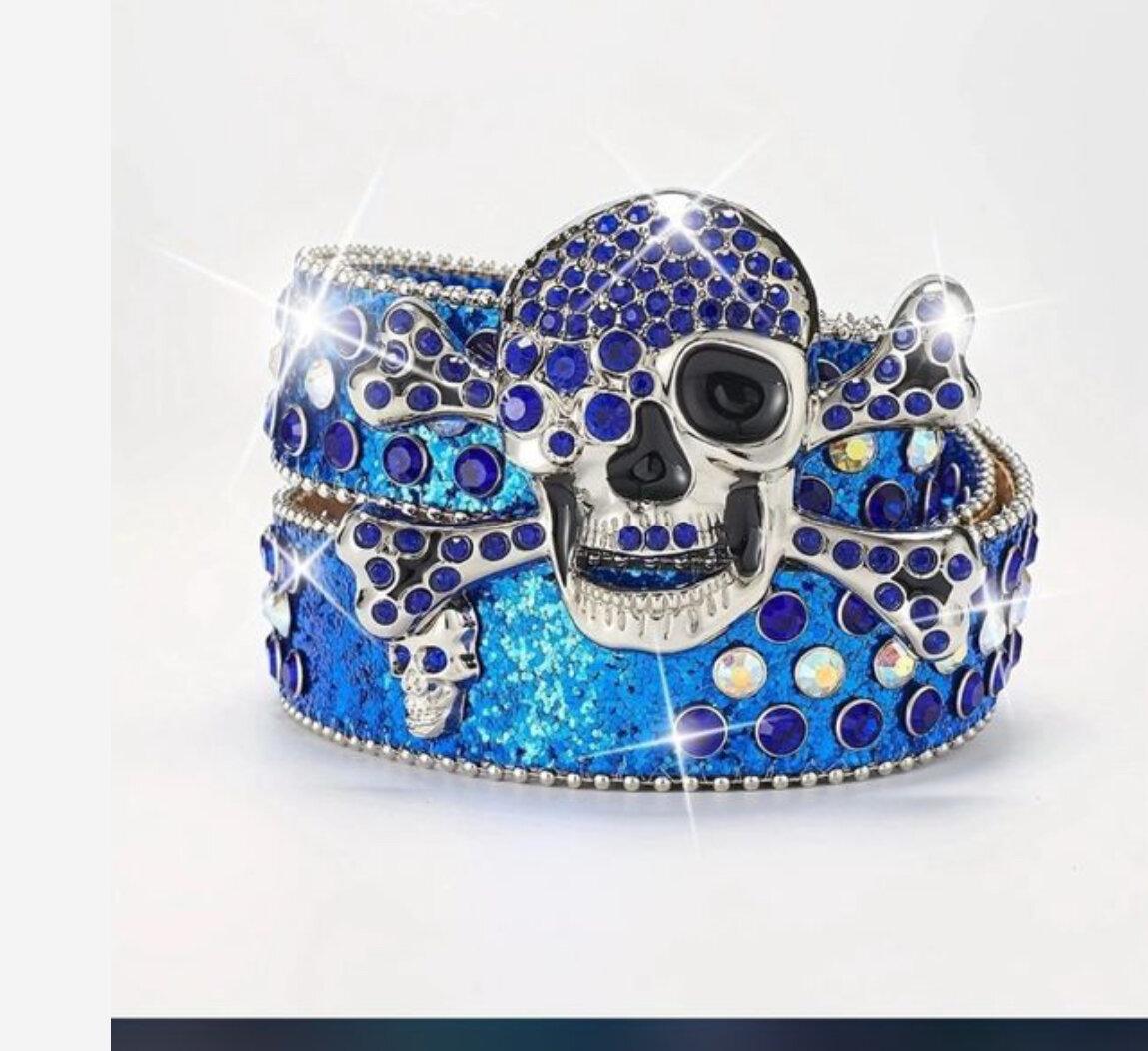Ajoutez une touche audacieuse à votre tenue avec cette ceinture ornée d'une tête de mort scintillante et de strass lumineux. Parfait pour un look rock ou gothique.