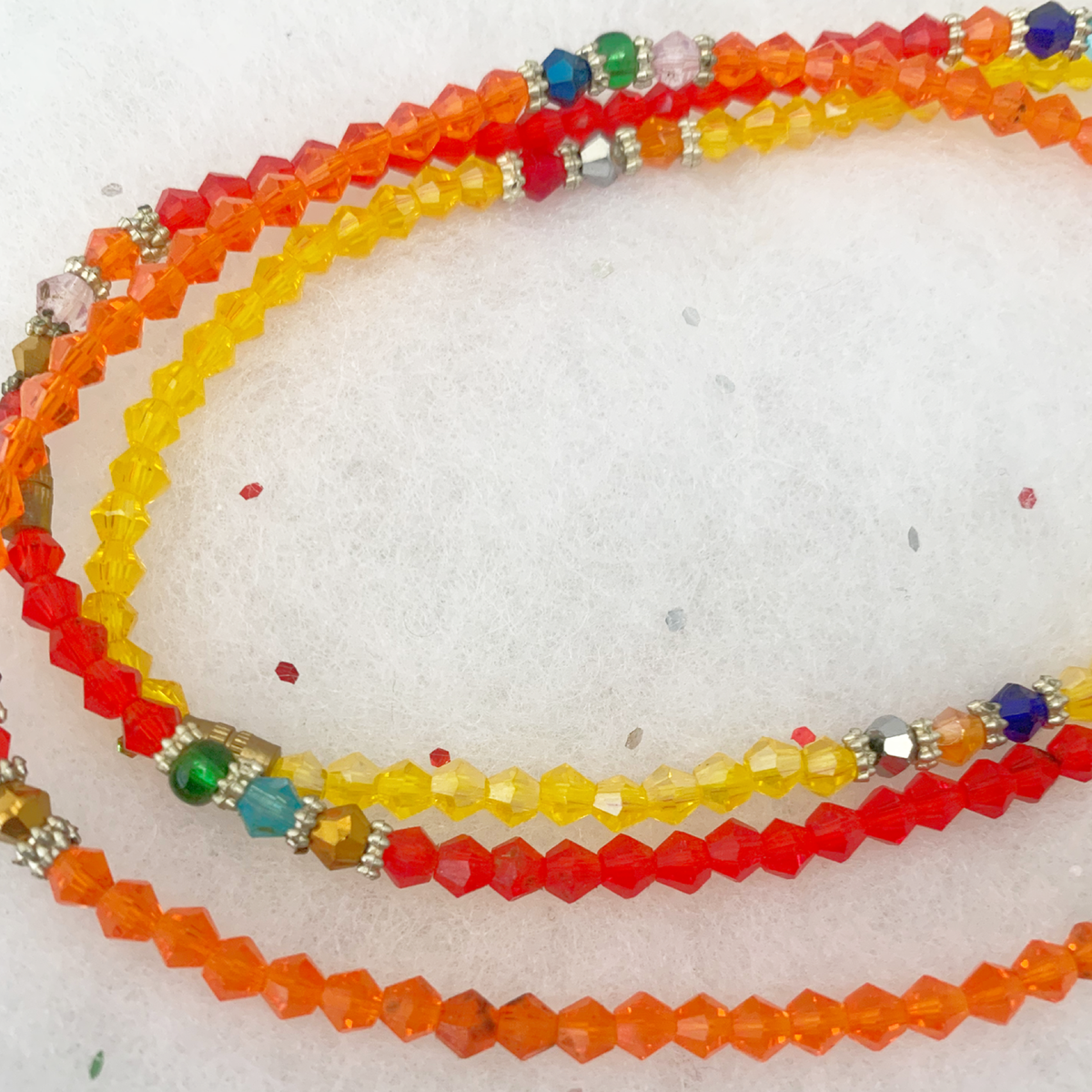 Ensemble de chaîne au pied en perles colorées orange et rouge. Faits de perles de verre, ils sont élégants et résistants. Idéal pour accessoiriser une tenue décontractée ou habillée.