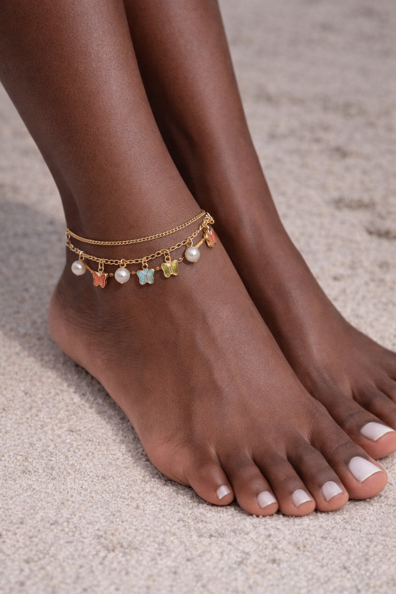 Chaîne de cheville en or avec breloques pour femme. Élégante et discrète, idéale pour les tenues de plage ou les occasions spéciales.