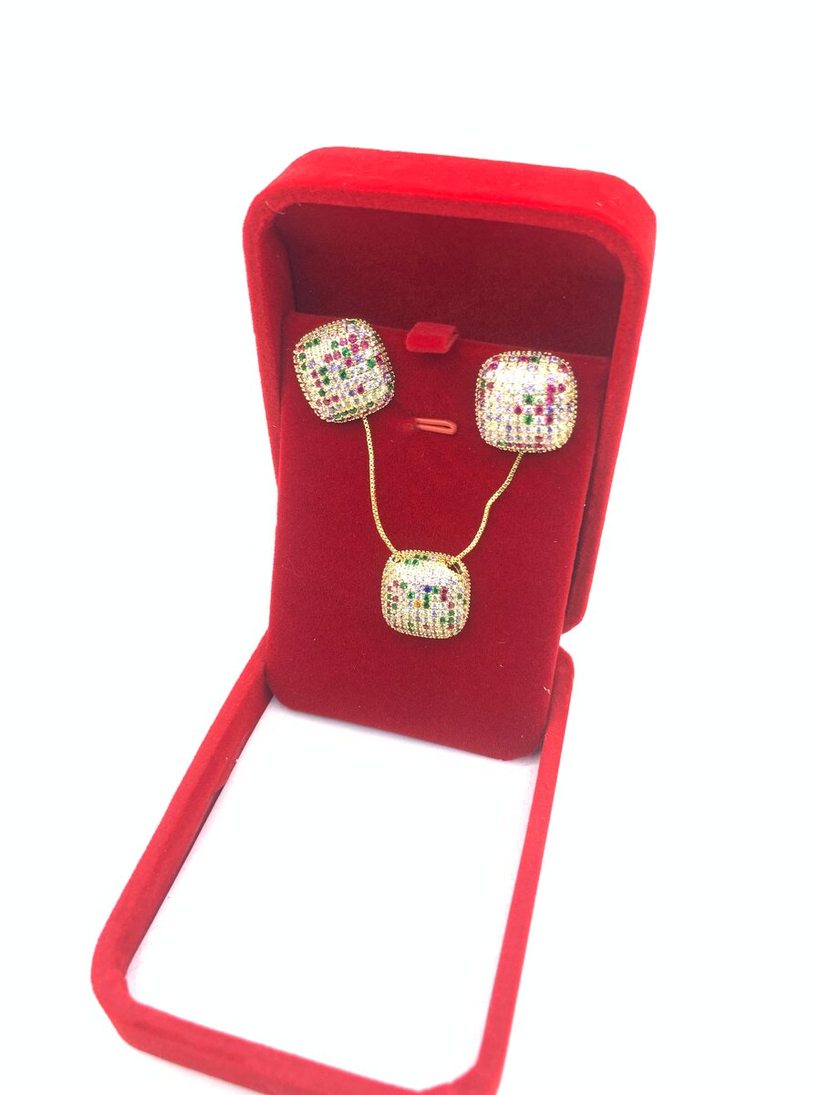 Parure comprenant des boucles d'oreilles et un pendentif en métal doré, ornés de pierres multicolores. Idéal pour compléter une tenue élégante.
