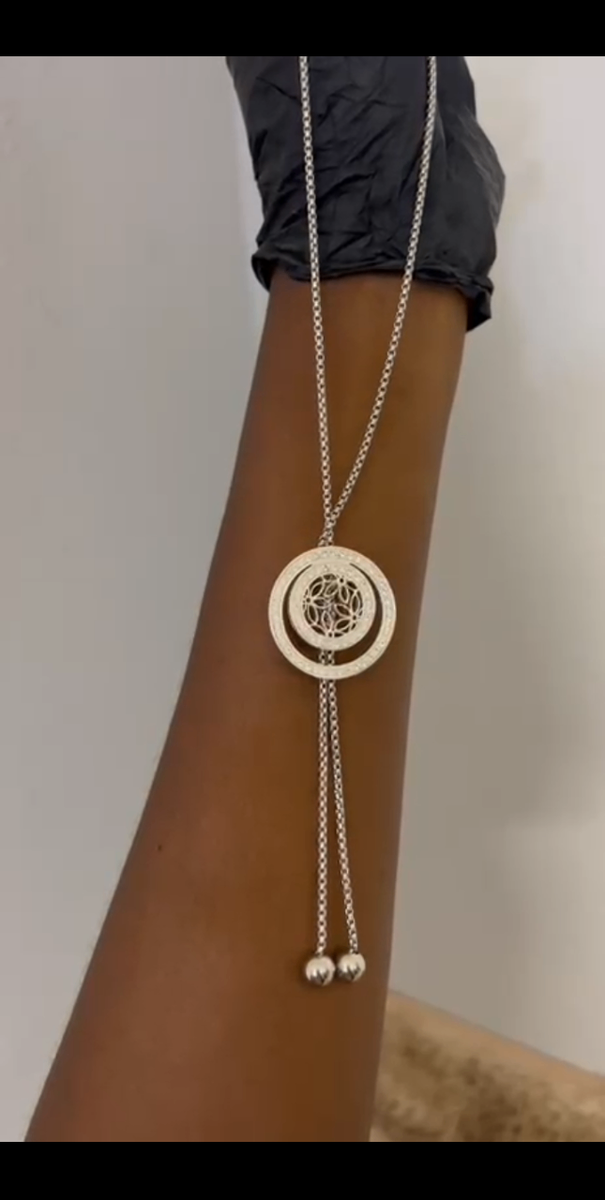 Élégant collier en argent avec un pendentif circulaire unique. Idéal pour ajouter une touche sophistiquée à toute tenue. Ajustable pour un confort optimal, parfait pour les occasions spéciales ou un usage quotidien.