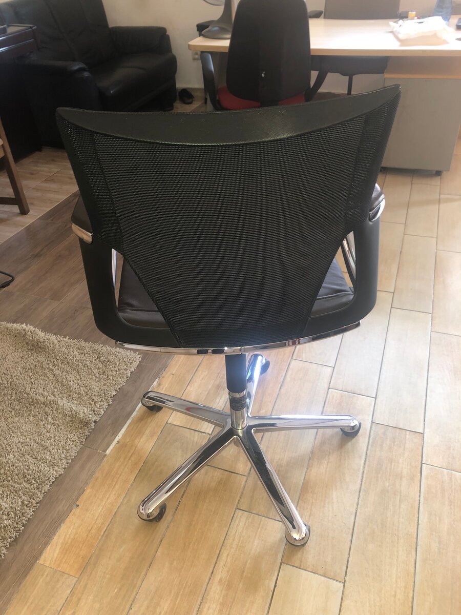 Chaise de bureau confortable et moderne avec accoudoirs, siège et dossier en maille noire. Idéal pour un usage prolongé au travail ou à domicile.
