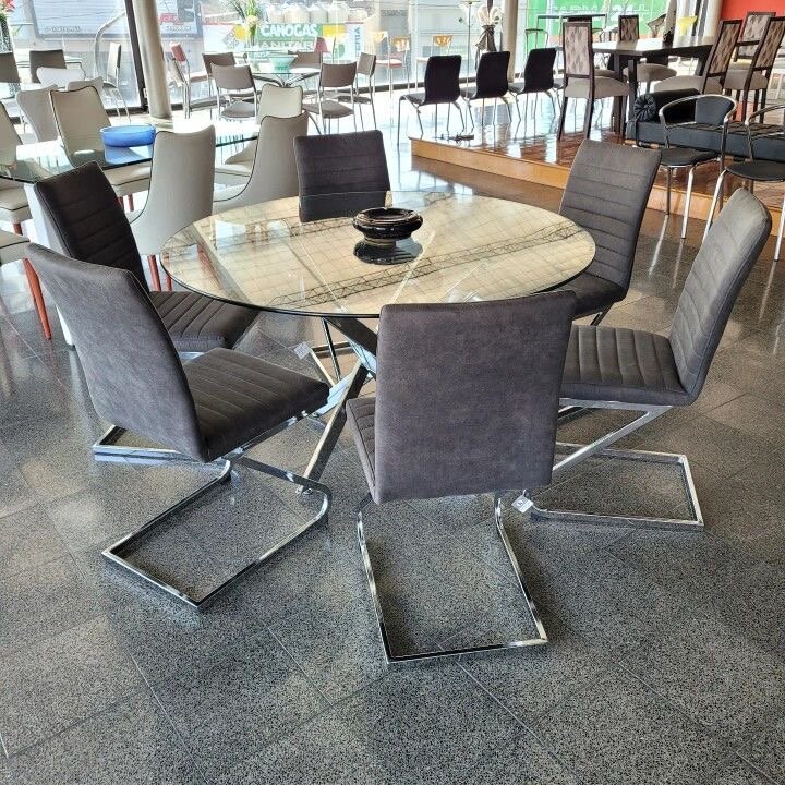 Élégante chaise de salle à manger avec une structure métallique chromée et un revêtement gris. Confortable et moderne, idéale pour les intérieurs contemporains.
