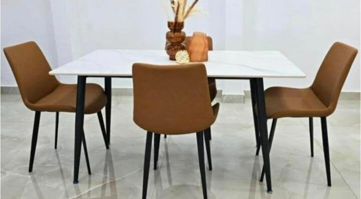 Chaise design en tissu marron pour salle à manger. Confortable et élégante, idéale pour une décoration moderne. Pieds robustes en métal noir.