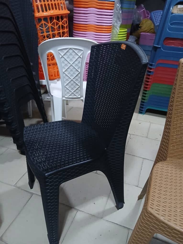 Chaise en plastique robuste de couleur noire avec un design imitation rotin. Idéale pour une utilisation intérieure ou extérieure. Facile à nettoyer et résistante aux intempéries.