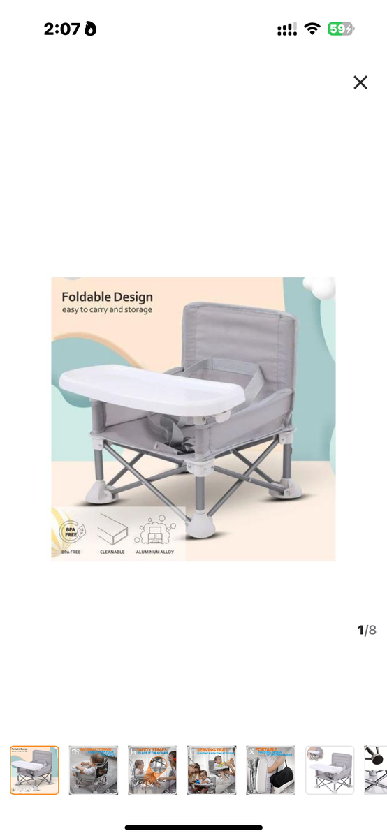 Chaise haute pliante et portable pour bébé, conçue pour les voyages. Sûre et facile à installer sur une chaise. Convient aux enfants de 6 mois et plus, jusqu'à 37 lbs. Léger et compact avec sac de transport inclus.