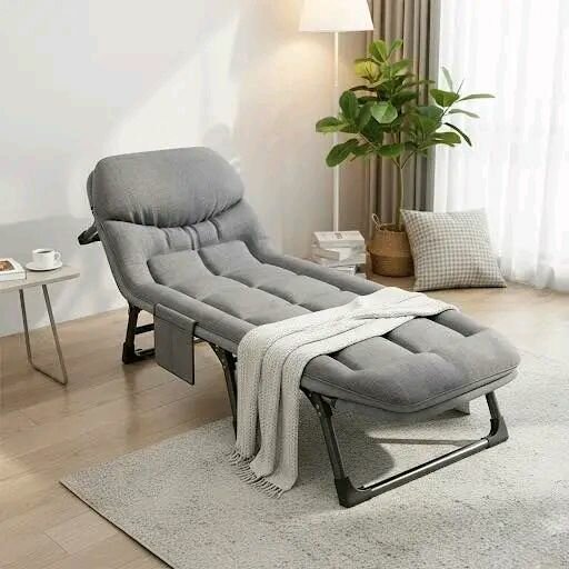 Découvrez notre chaise longue pliable en tissu gris, idéale pour la détente à l'intérieur ou à l'extérieur. Confortable et élégante, elle est parfaite pour lire ou se reposer.