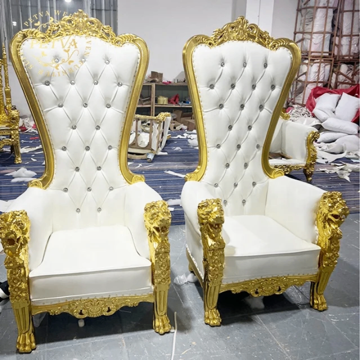 Découvrez ces chaises majestueuses au design royal, parfaites pour ajouter une touche de grandeur à votre espace. Fabriquées avec du cuir blanc de haute qualité et un cadre doré finement sculpté, ces chaises sont idéales pour des événements spéciaux ou comme pièces décoratives dans le salon. Confortables et élégantes, elles captivent par leur esthétique somptueuse et leur qualité exceptionnelle.