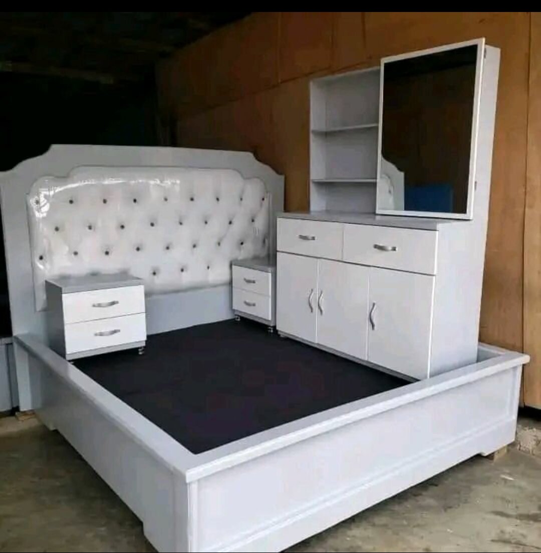 Ensemble de chambre moderne comprenant un lit avec tête de lit capitonnée, des tables de nuit et une armoire avec miroir. Fabrication de qualité, design élégant et fonctionnel. Convient pour une chambre adulte.