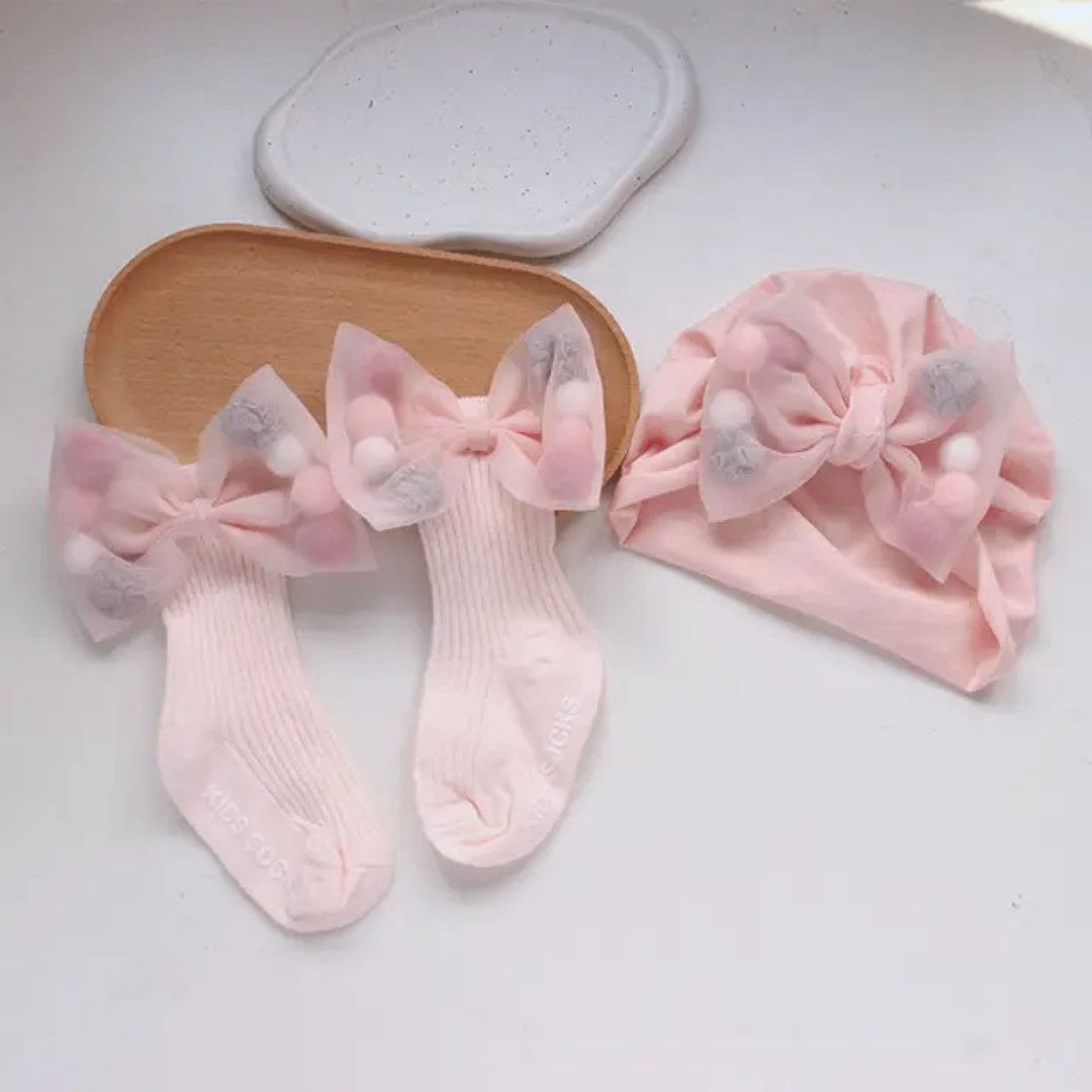 Ensemble adorable pour bébé, comprenant un chapeau et des chaussettes assortis avec des nœuds décoratifs en pompons doux. Idéal pour garder votre bébé au chaud tout en ajoutant une touche de style. Parfait pour les occasions spéciales ou un usage quotidien.