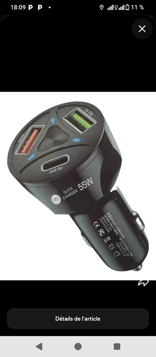 Chargeur de voiture rapide 35W avec ports USB et USB-C pour smartphones et appareils. Conçu pour une utilisation en voiture, il offre une charge rapide et sécurisée.