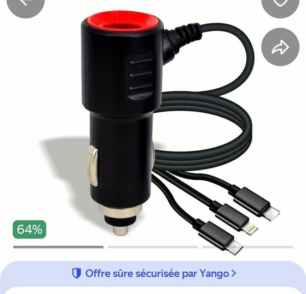 Optimisez votre trajet avec ce chargeur de voiture 3-en-1 puissant et intelligent. Conçu pour une charge rapide et efficace de vos appareils, parfait pour les longs trajets et les déplacements quotidiens. Compatibilité universelle.