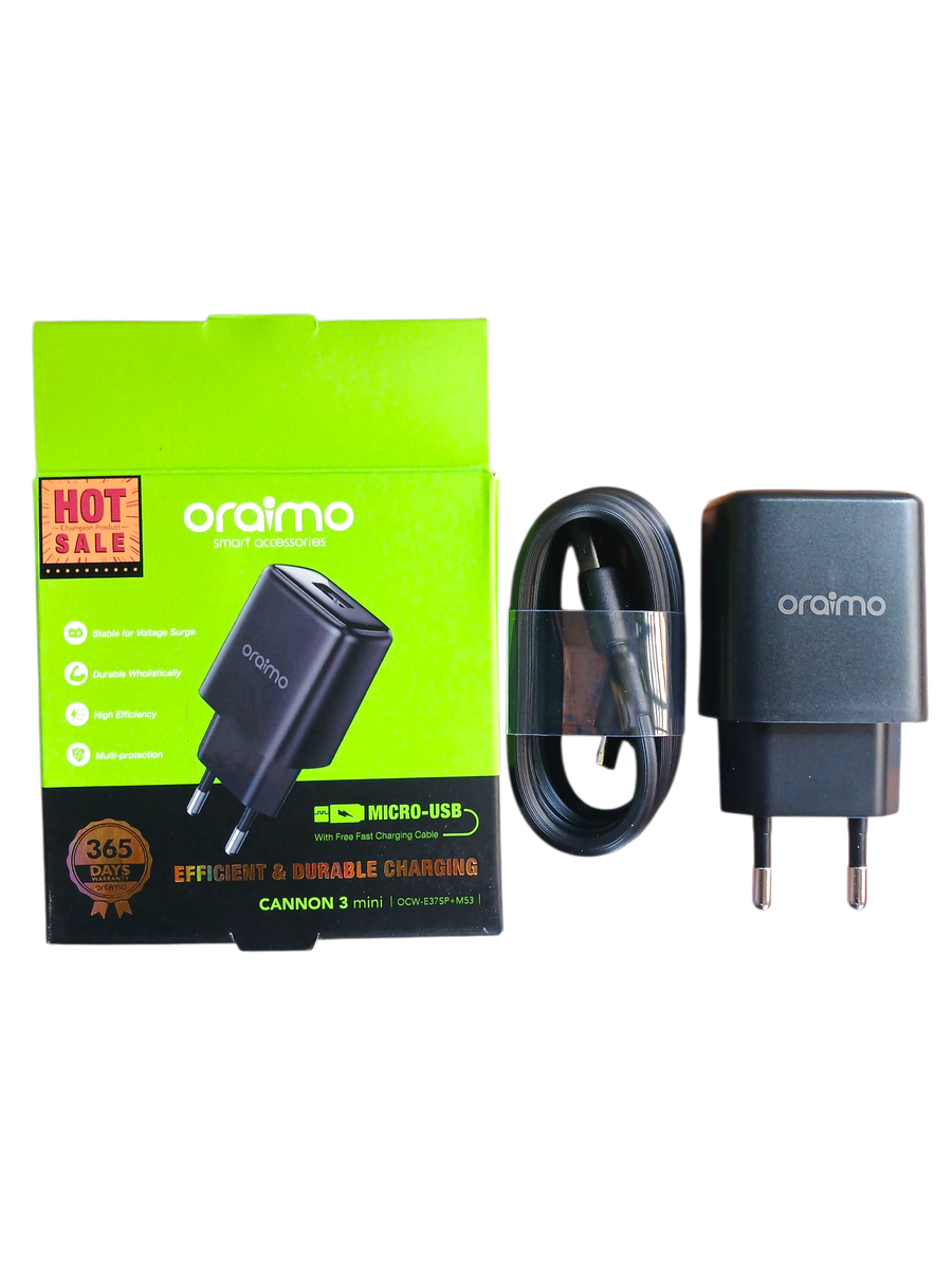 Chargeur Oriamo Micro-USB rapide et durable avec câble inclus, idéal pour un chargement quotidien efficace et sécurisé.