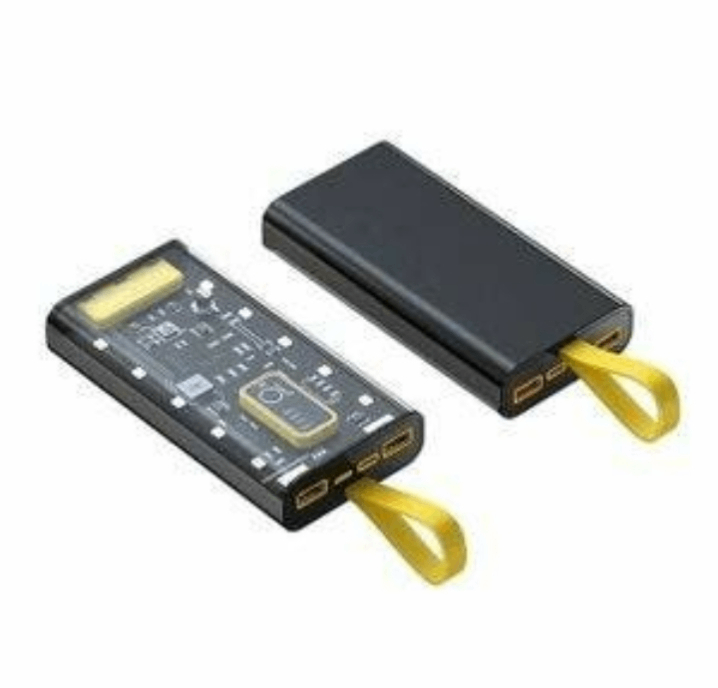Power bank transparent et élégant avec capacité élevée pour plusieurs charges. Compact et facile à transporter, idéal pour les voyages. Ports multiples pour divers appareils. Design moderne avec vue sur les circuits internes.