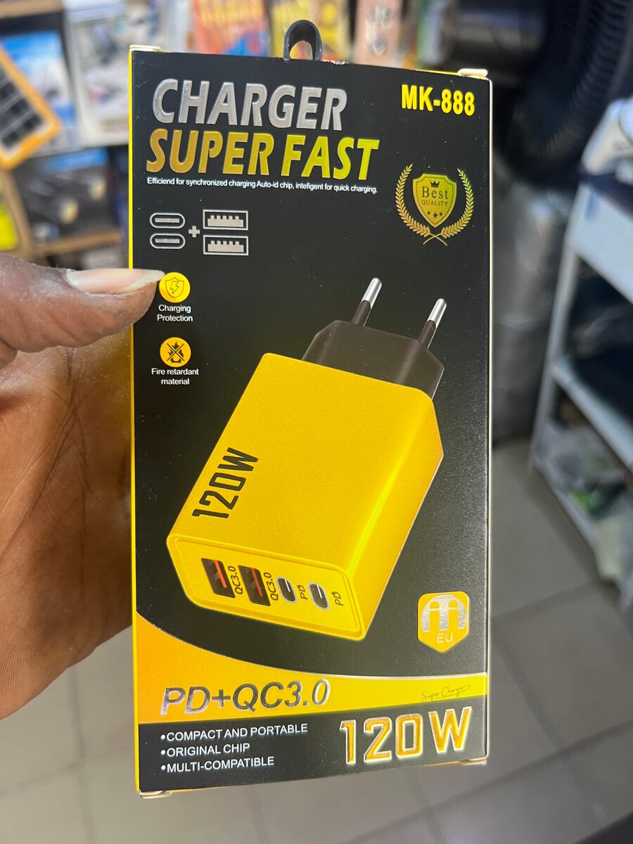 Chargeur super rapide 120W avec technologie PD+QC3.0. Compact et portable, compatible avec plusieurs appareils. Charge rapide et efficace.