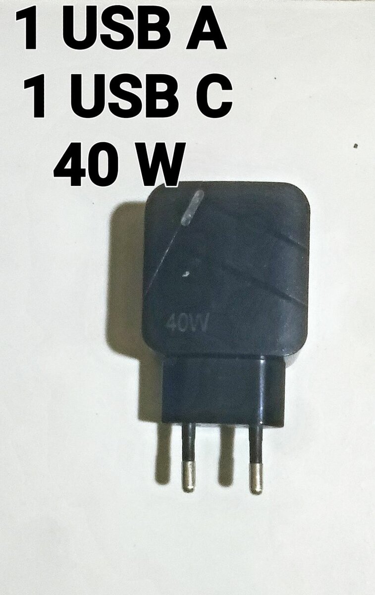Chargeur compact avec 1 port USB A et 1 port USB C, 40W. Idéal pour charger vos appareils rapidement.