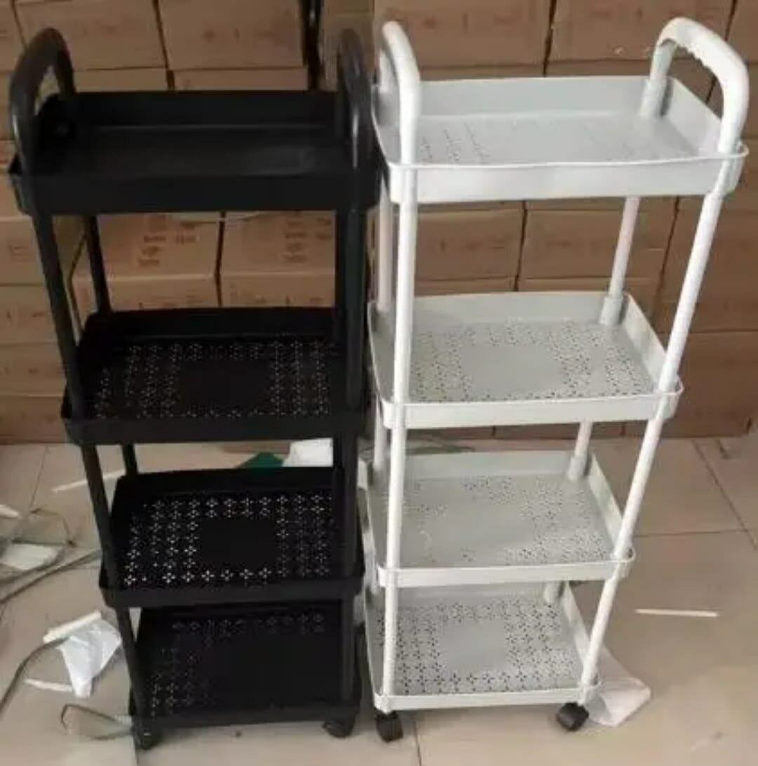 Chariot de rangement multi-usage avec 3 ou 4 plateaux, idéal pour la cuisine, la salle de bain ou le bureau. Robuste et facile à déplacer, disponible en noir et blanc.