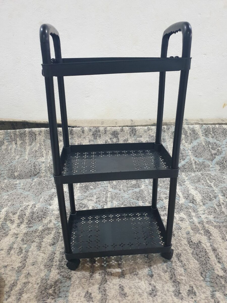 Organisez votre espace avec ce chariot de rangement pratique à trois niveaux. Idéal pour la cuisine, la salle de bain ou le bureau, ses étagères perforées permettent une ventilation optimale. Solide, léger et facile à déplacer grâce à ses roulettes, c'est le choix parfait pour un rangement flexible et élégant.