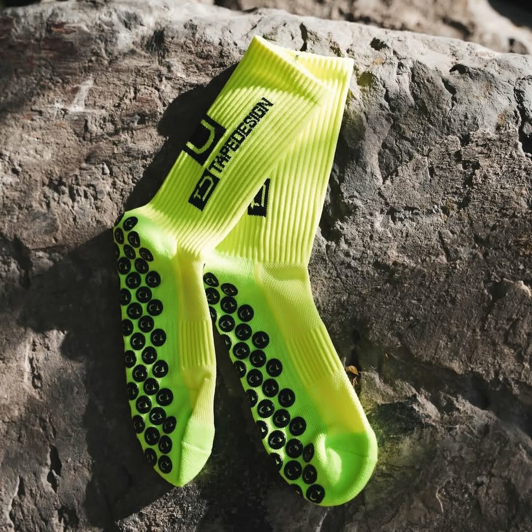 Découvrez les chaussettes de sport Tapedesign jaune fluo, conçues pour les activités outdoor et de trail. Ces chaussettes offrent une adhérence exceptionnelle grâce à leurs crampons en caoutchouc. Idéales pour les coureurs et les amateurs de plein air.