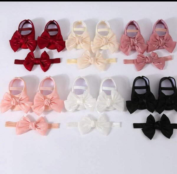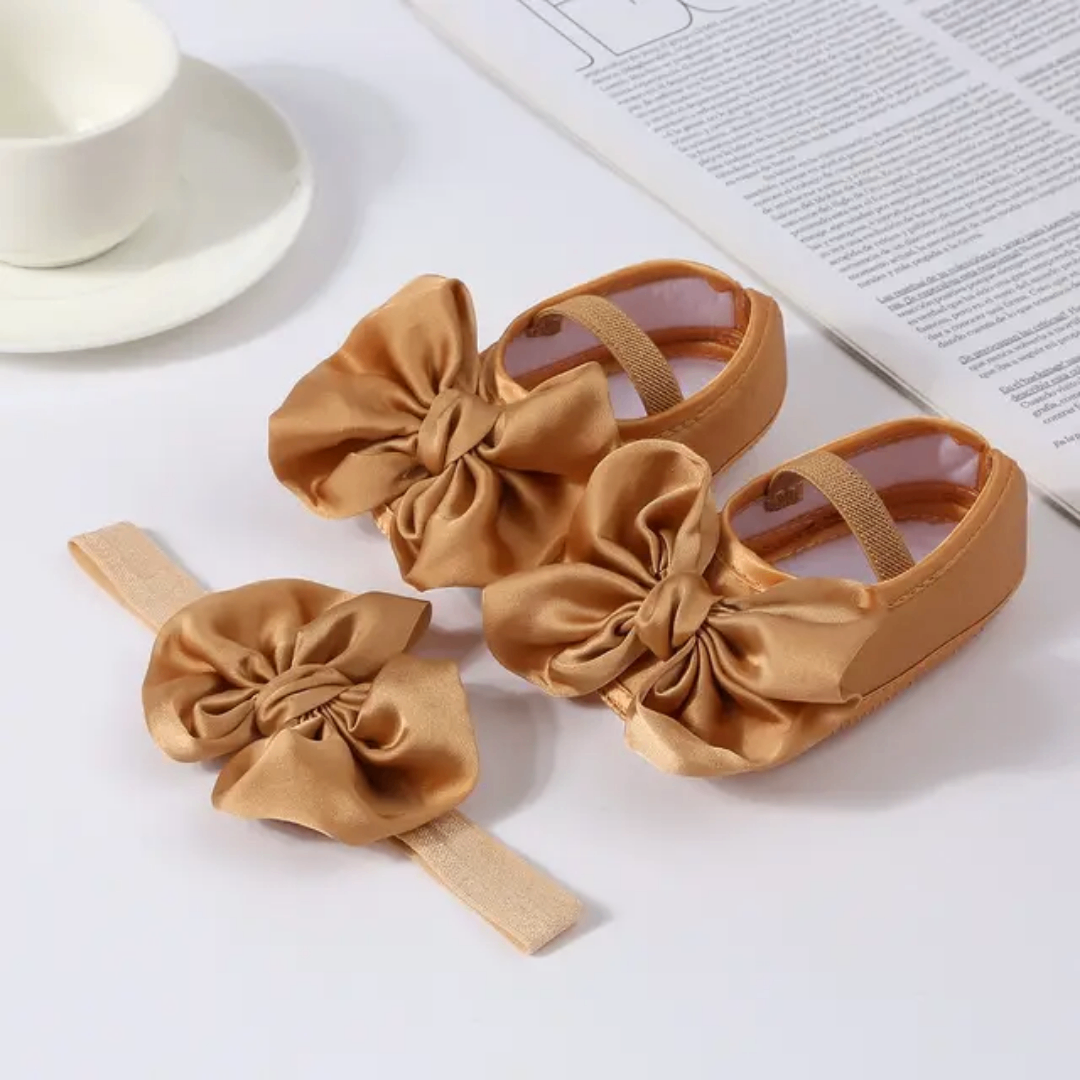 Adorables chaussons bébé en satin avec nœud assorti, parfaits pour ajouter une touche élégante aux tenues de votre petite princesse. Idéal pour les occasions spéciales ou le quotidien, ce set inclut un joli bandeau assorti.