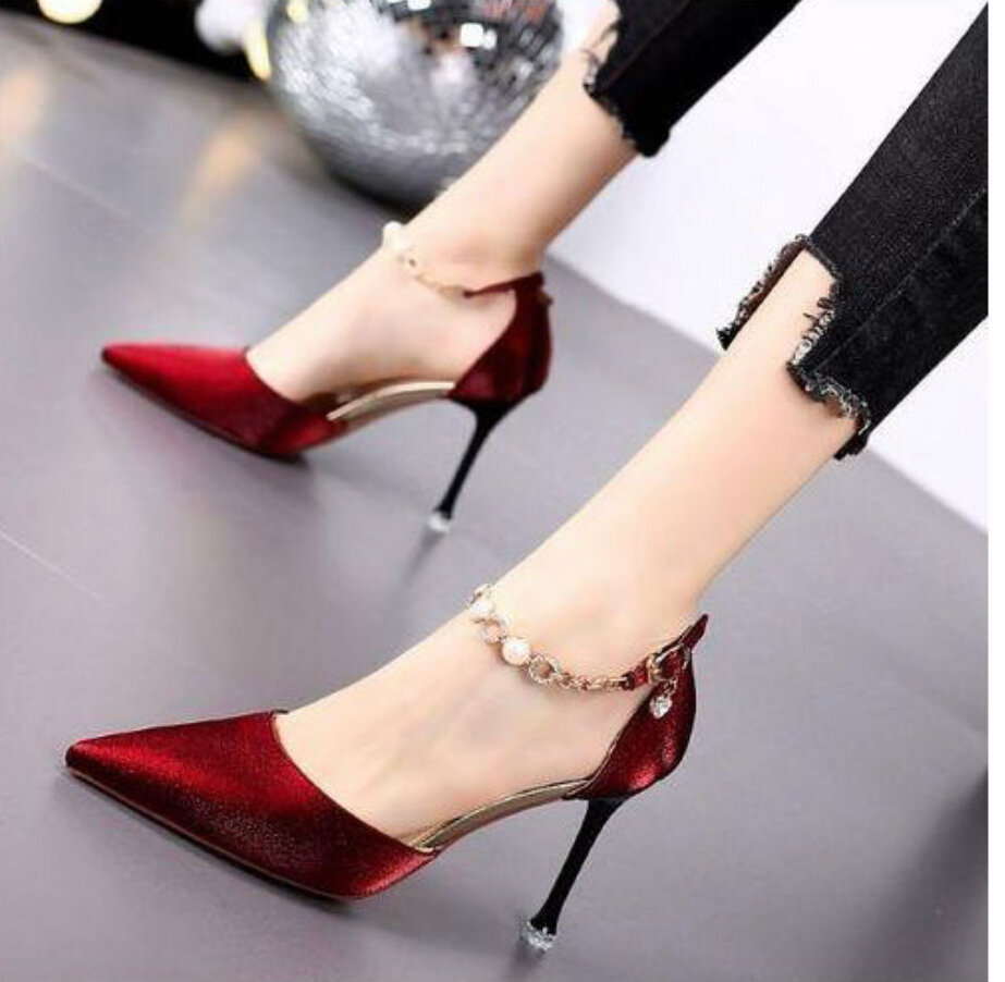 Chaussures à talons hauts rouges avec bracelet à perles, parfaites pour une soirée élégante. Conçues pour les femmes qui aiment la mode et le confort. Cadeaux de saint Valentin