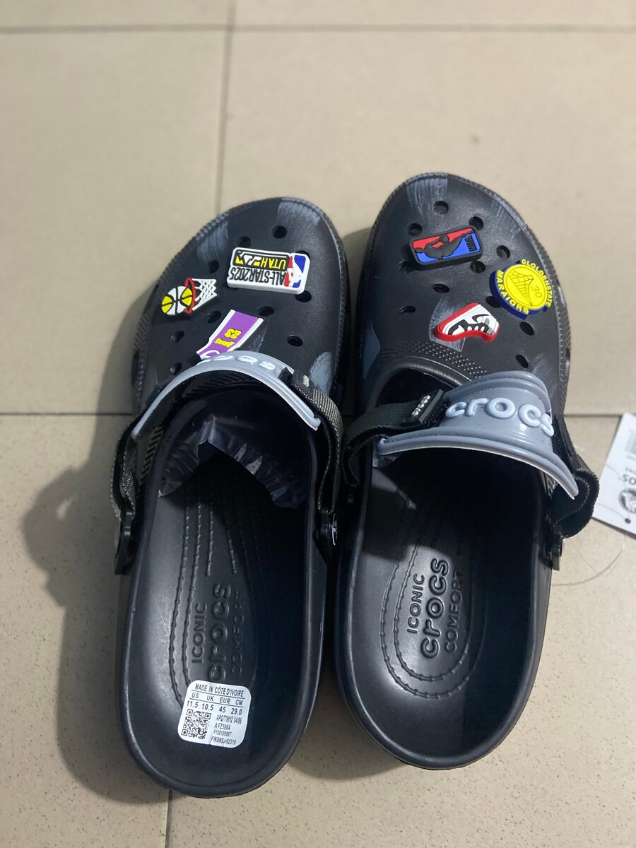 Découvrez ces chaussures Crocs noires avec des décorations amusantes. Conçues pour le confort, elles sont idéales pour les activités décontractées. Personnalisez-les avec des Jibbitz pour refléter votre style.