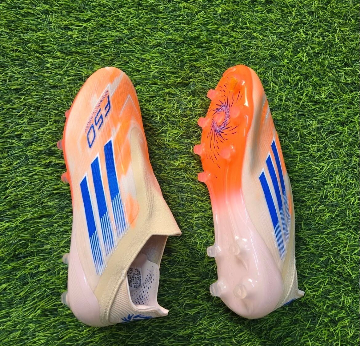 Découvrez les chaussures de football Adidas, parfaites pour les terrains en herbe. Avec un design accrocheur en bleu et orange, elles offrent adhérence et confort pour des performances optimales. Idéales pour les joueurs passionnés.
