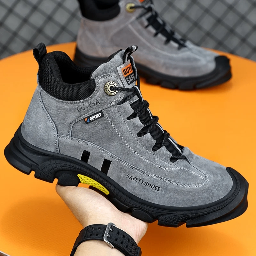 Chaussures de sécurité robustes avec bout en acier, semelle anti-perforation et semelle extérieure en caoutchouc résistant à l'usure. Idéales pour les travailleurs de la construction et les environnements industriels.